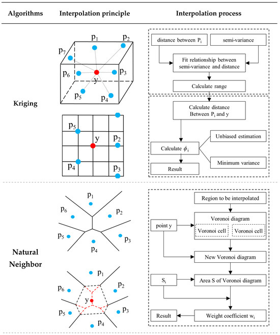 Based on the Delaunay triangulation and Voronoi diagram, the Natural Neighbor interpolation algorithm calculates the interpolation result of the point according to the contribution rate of each Natural Neighbor point [44]. Assuming the Natural Neighbor points of point count , namely, , the interpolation algorithm is as follows: