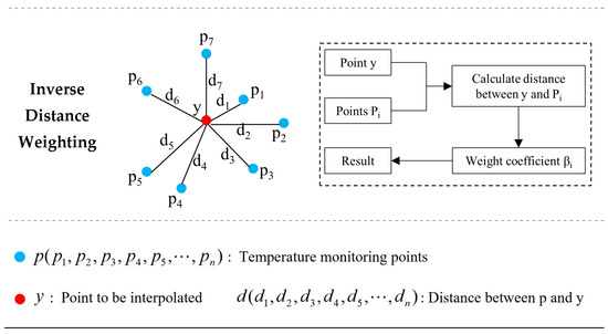 For the Inverse Distance Weighting interpolation algorithm, the distance between the point to be interpolated and the monitoring points is weighted, setting as . The closer a monitoring point is to the point to be interpolated, the greater the weight given to this monitoring point will be [35]. The weight contribution is inversely proportional to the distance between the two points.