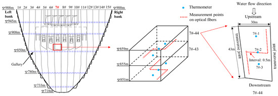 The locations of digital thermometers, optical fiber measurement points, and concrete block 7#-44 of the WDD dam. “#”: This symbol is used to represent the numbering of concrete block. “∇”: This symbol indicates the elevation level, which is a standard representation in engineering and geological diagrams. Red “7#”: The red color is used to highlight the selected concrete block, which corresponds to dam section 7#.