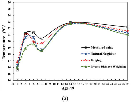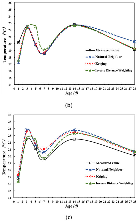 Surfer (version 14) was employed to perform the three interpolation algorithms, which is professional interpolation software Surfer (version 14) [45]. The data analyzed were collected from the 7#-44 dam block in the WDD dam during its construction, and the optical fiber layout scheme is “Z” type [24], as shown in Figure 5. The low-heat Portland cement was utilized, with a slump of 30–40 mm. The concrete incorporates 35% fly ash and 0.6% water-reducing admixture. Based on the field measurements, the ambient temperature was 19.6 °C on the upstream side and 20.3 °C on the downstream side when 7#-44 was poured. The reconstructed thermal field in this study is based on actual temperature measurements from the optical fibers, meaning that factors such as cooling water, ambient temperature, and pouring temperature are inherently considered. Thermal field reconstruction results are illustrated in Figure 6, Figure 7 and Figure 8, respectively.