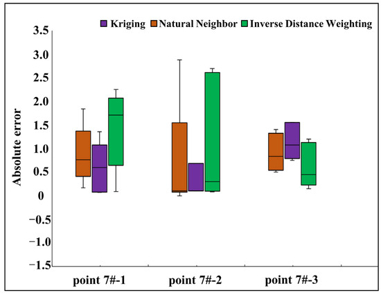 At 7#-1, the maximum error between the reconstructed temperature and the measured temperature was 1.89 °C. After Day 14, the errors decreased and the reconstruction results converged toward the measurement. At 7#-2, the Natural Neighbor and Kriging interpolation worked well before Day 14. From Day 14 to Day 28, the error of Natural Neighbor gradually increased to 1 °C on Day 28. The Inverse Distance Weighting result has a significant error when compared with the measurement. At 7#-3, Natural Neighbor has the maximum error of 1.55 °C. Table 1 presents the errors between the measured temperature values and the reconstructed temperature values for the three interpolation algorithms. The box plots were obtained by calculating the absolute error, as shown in Figure 10. As can be seen, the errors were the greatest by the Inverse Distance Weighting and the smallest by the Kriging, indicating that the Kriging interpolation algorithm works best.