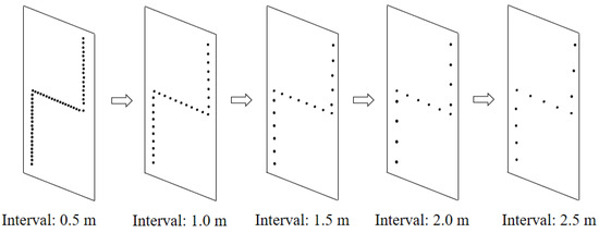 To reduce the calculation load of thermal field reconstruction and improve the response speed, it is crucial to investigate the impact of the number of temperature-monitoring points on the reconstruction results of the thermal field. A total of 58 monitoring points, spaced at 0.5 m intervals, were selected from the 7#-44 concrete block of the WDD dam. Subsequent datasets were generated by setting monitoring point intervals to 1.0 m, 1.5 m, 2.0 m, and 2.5 m, respectively, as illustrated in Figure 11.