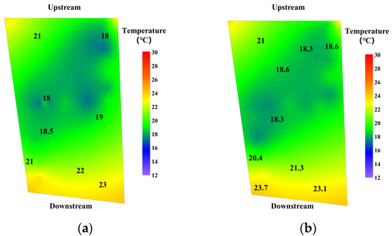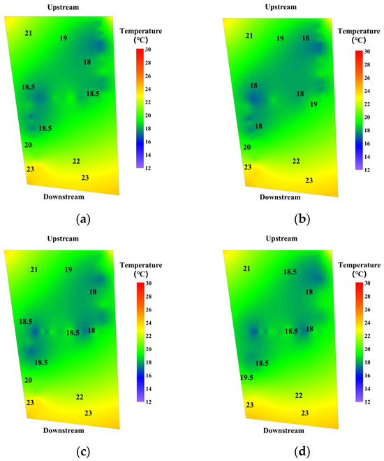 By comparing the interpolation results of these datasets with varying intervals (Figure 12), the effect of the number (or density) of temperature measurement points on thermal field reconstruction was analyzed. The analysis revealed that, as the number of temperature-monitoring points decreased, the reconstructed thermal fields remained nearly identical. Minor differences were observed only in the center of the dam block, with the maximum deviation being less than 1 °C. The temperature reconstructions near the upstream surface, downstream surface, and transverse joint surface were virtually identical. Even with a reduced number of monitoring points, the accuracy of the reconstructed thermal field continued to meet the temperature control requirements (e.g., within 1 °C). In summary, the Kriging interpolation algorithm, combined with the “Z” pattern of fiber embedding, allows for a reduction in the number of temperature-monitoring points while still ensuring the accuracy of the reconstructed thermal field.