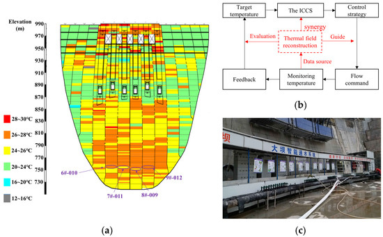 To meet the above temperature control requirements, an intelligent cooling control system (ICCS) for concrete temperature control was implemented in the WDD dam construction, combining water-cooling pipes with thermal field reconstruction. Contractors can log in to the intelligent temperature control system via their mobile phones to query the real-time thermal field of each concrete block, which provides a real-time judgment basis for the evaluation of the concrete temperature control effect. This methodology surpasses traditionally used numerical simulations and analyses that lag far behind construction progress. The maximum temperature of the concrete did not exceed the temperature control requirements, and a great temperature control effect was achieved (Figure 16a,c). The engineering application procedure summarized in Section 3.4 was applied in the ICCS (Figure 16b), and the thermal field was reconstructed.
