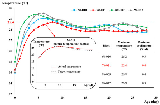 By comparing the actual temperature curve of the 6#-010, 7#-011, 8#-009, and 9#-012 blocks, the maximum temperature of the 7#-011 block was significantly lower than the other three, which was 25.4 °C (in line with the temperature control requirement) (Figure 17). The maximum cooling rate of the 7#-011 block was 0.4 °C/d, which also met the temperature control requirement. In addition, the temperature curve of the 7#-011 block was smoother, meaning that the water-cooling strategy for the 7#-011 block was more effective than the other three, and the temperature difference was much lower. Due to the real-time thermal field reconstruction, the cooling strategy was able to be adjusted in time, the temperature stress was well controlled, no temperature cracks appeared, and precise temperature control was achieved. The successful application of the proposed method guaranteed the construction quality of the WDD dam, and, on 16 June 2021, all 12 water turbines were put into operation.