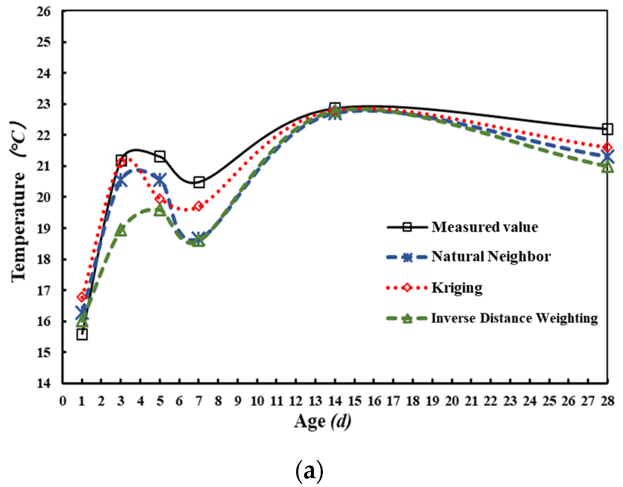 As monitoring data update, interpolation methods can reveal the temporal variation of concrete temperatures in dams [26]. In engineering practice, achieving real-time temperature control for each concrete block requires balancing accuracy and efficiency in thermal field reconstruction. Specifically, the accuracy and efficiency of interpolation methods depend on three main factors: the interpolation algorithm, the number of monitoring points, and their positions. In terms of interpolation algorithms, various algorithms were proposed, and their differences in soil temperature [27], sea surface temperature [28], and air temperature [29] have been analyzed. However, the accuracy of these algorithms in concrete dams still lacks quantitative evaluation.