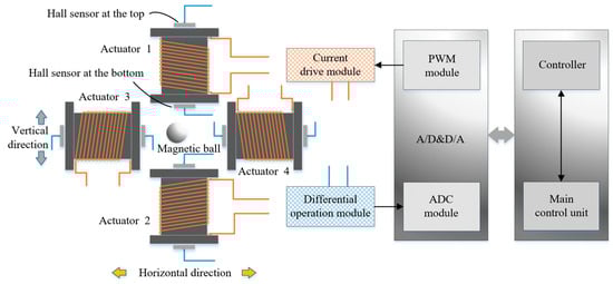 The position control process of the active maglev actuating system is shown in Figure 2. Firstly, the magnetic field signals are collected through the dual-hall sensor distributed uniformly above and below, and the collected position signals are processed by hardware differential to obtain the position signals of the magnetic ball. An AH49H linear hall effect sensor is used as the sensor of the system. The collection range is ±3000 Gauss, with excellent temperature stability, reliability, and sensitivity. The sensor distribution mode is used to eliminate the influence of the magnetic field of actuators on the acquisition results. Compared with the laser position sensor and the eddy current sensor [], the hall sensor is not affected by the material and light refraction of the controlled object and can accurately collect the magnetic field around the magnetic ball, which makes the application of active maglev actuation more extensive.