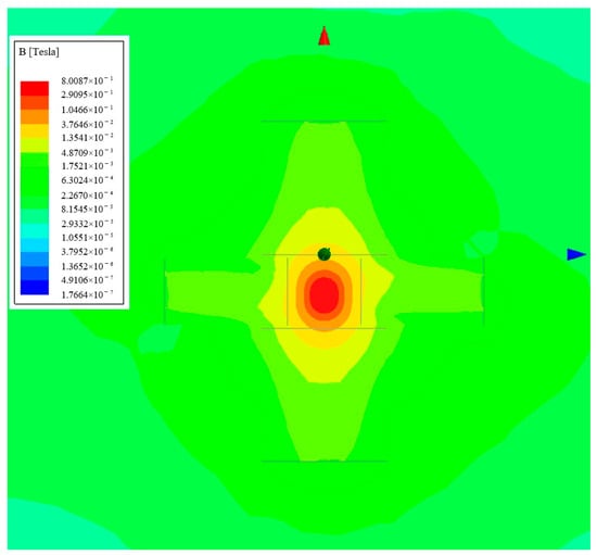 According to the position relationship between the magnetic ball and the electromagnetic actuators, as shown in Figure 4, the resultant electromagnetic force in a single direction exerted by the two magnetic actuators on the magnetic ball is the vector sum of the electromagnetic force. The magnetic field distribution of the two-dimensional actuating structure is shown in Figure 5. The electromagnetic force limit of the magnetic ball in different levitation positions can be guided by the attenuation of the magnetic field. According to (3), respectively, the superimposed electromagnetic forces on the magnetic ball in the vertical direction and the horizontal direction are