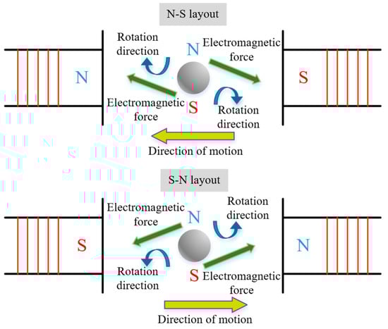 In the horizontal direction, the current values of the electromagnetic actuators are adjusted by the mode of fixed duty ratio, and then the horizontal motion of the magnetic ball in the levitation range is actuated and controlled. As shown in Figure 7, a different polarity relative is used in the arrangement form of horizontal electromagnetic actuators. In the same arrangement, the rotation direction of the magnetic ball is the same when subjected to the left and right arbitrary electromagnetic forces. The test verifies that the magnetic ball moves in a unique direction under the same arrangement. By changing the polarity of the electromagnetic actuators, the magnetic ball can be offset in the left and right parts of the axis.