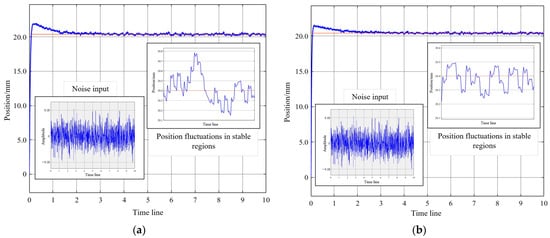 Add ambient noise to the input signal due to the good adaptability to the nonlinear complex system of neural networks with unclear models [,,]. The neural network PID control method and model-based control method were used to test the robustness of the designed maglev system, respectively. The test curves are shown in Figure 9a,b. It can be seen from the results that after adding the same amplitude of noise, the magnetic ball can achieve stable levitation under both control methods. The position fluctuation range of the magnetic ball stably suspended by the neural network PID controller is ±0.155 mm, and the position fluctuation range by the model-based controller is ±0.320 mm. In contrast, the maglev actuating system using a neural network PID controller has a stronger anti-interference ability to the environment, and the levitation of the ball is more stable. Therefore, the neural network PID controller is adopted.