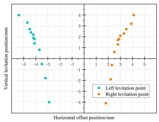 The actual levitating actuation and control of the active maglev actuating system is carried out. As shown in Figure 8, the control effect of the controller on the actual levitation system is obtained through the test. In the vertical direction, the initial position of the magnetic ball is −25.50 mm, and the target balance position is −21.70 mm. In the horizontal direction, the initial position is on the axis, and the target balancing position is 4.38 mm to the left of the axis.