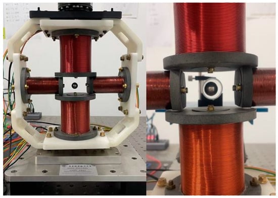 Maglev (magnetic levitation) actuating technology as a wireless actuating technology is gradually applied [,,,]. Most maglev motions in industrial and medical fields require active motion control with accurate and relatively large displacement [,,,]. The existing research is to make the controlled object rotate in liquid to generate propulsive force through the special helical structure of the controlled object under the action of the external magnetic field so as to realize the levitated motion of the controlled object [,,]. Donghak Byun [] developed a tadpole-type swimming micro-robot. The micro-robot is actuated by an alternating magnetic field composed of two pairs of vertical Helmholtz coils, and the form of motion is a tail swing. The direction and frequency of the tail swing are adjusted by magnetic field changes. Seungmun Jeon [] proposed a method that uses a combination of a gradient magnetic field and a uniform magnetic field to actuate a spiral micro-robot. This method provides a new navigation and drilling method for dredging blood-vessel blockages. Non-dynamic models and traditional model-based controls are mostly used in current maglev actuation [,,,,]. These methods are prone to rapid deterioration of tracking performance, insufficient control ability, small control range, and other problems, and they can only achieve passive levitation motion of the controlled object in liquid [,]. In practical applications, maglev actuation is mostly used in air environments, but the application range of maglev is limited due to passive levitation by liquid buoyancy. In addition, the maglev actuating system cannot be applied to the occlusion environment due to the limitation of the existing acquisition mode of the sensor, which makes it difficult to be applied in practice [,]. Therefore, active maglev actuating technology has wide application prospects in industry fields.