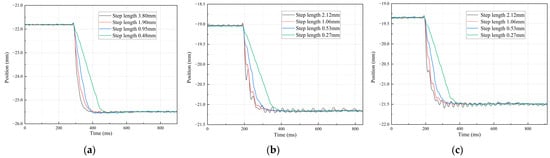 When the controlled levitated object directly responds to a longer step input, the controlled object is prone to uncontrolled fall due to the nonlinear relationship between the electromagnetic force and the levitation gap. The significant overshoot means that the motion process of the controlled object is not stable. Vertical levitation actuation is divided into three parts: the actuation on the axis, the actuation on the left side of the axis, and the actuation on the right side of the axis. The motion step length on the axis is set at 3.800 mm, 1.900 mm, 0.950 mm, and 0.476 mm, respectively. The magnetic ball on the non-axis is subjected to horizontal transverse shear force, and excessive step length will cause a large shaking of the ball. Therefore, the motion step length of the left and right sides of the axis is set at 2.120 mm, 1.060 mm, 0.530 mm, and 0.266 mm, respectively, for the test. The number of steps from the initial position to the target position is 1, 2, 4, and 8. When the ball is on the left and right side of the axis, the horizontal distance from the axis is 3.240 mm and 3.070 mm, respectively. In the vertical direction, the levitation motion from −25.500 mm to −21.700 mm on the axis is taken as an example, the levitation motion from −21.150 mm to −19.040 mm on the left side of the axis is taken as an example, and the levitation motion from −21.500 mm to −19.350 mm on the right side of the axis is taken as an example. The influence of different step lengths on the overshoot of the step response during descending motion and ascending motion is compared, respectively. The comparison results are shown in Figure 12 and Figure 13.