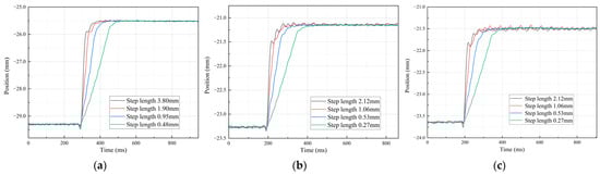 As can be seen from Figure 12 and Figure 13, the overshoot reaching the target equilibrium position in one step is large and fluctuates greatly in the process of motion, with obvious fluctuation. This is because the motion distance is too large, resulting in aggravated errors between the mathematical model and the actual model, coupled with the limited control ability of the controller, resulting in large errors in motion. The number of motion steps is from one step to two steps, four steps, and eight steps. As the step length is gradually shortened, the overshoot decreases gradually, and the motion curve becomes smoother and smoother. After reaching the target position, the levitation stability becomes stronger. Compared with the direct response to the target signal, the step-by-step actuating control method based on force imbalance significantly reduces the overshoot of the step response of the controlled levitated object. And the smaller the step length, the smaller the overshoot. However, the increasing number of steps leads to a gradual increase in adjustment time, and the relationship between step length and adjustment time is not monotonous. The adjustment time is the minimum time required to reach and keep within the final steady-state error, so the increase in adjustment time makes the system’s response ability relatively weakened. After reaching the target position, the stability of non-axial levitation is lower than that of axial levitation. This is because, in the non-axial suspension state, the horizontal shear force aggravates the inertia motion of the ball, which makes the ball shaking worse.