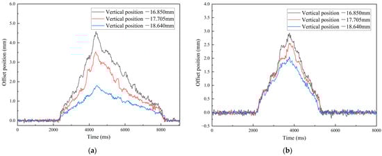 In the horizontal direction, the hall sensor at the bottom of actuator 1 is the origin of coordinates, and the levitation gaps are set at 16.850 mm, 17.705 mm, and 18.640 mm, respectively, for testing. The influence of different step lengths on the step response overshoots of the controlled object is compared. The test process includes the outbound journey and the return journey of the ball offset at different set levitation gaps, and the comparison results are shown in Figure 14.