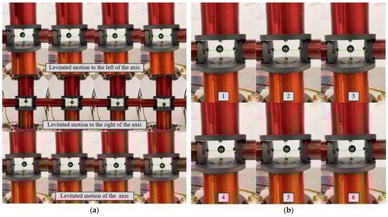 As can be seen from Figure 14, the horizontal motion is limited by the vertical levitation force and affected by inertia. The speed change of the step-by-step motion causes the ball to shake. Therefore, the horizontal step length has a great influence on the fluctuation. According to the test results, the faster the motion speed, the greater the impact of inertia on the levitation motion of the ball; that is, the more frequently the fluctuation and shaking occur in the process of motion, the poorer the stability of the levitation motion. Due to the limited acquisition range of the sensor, the smaller the levitation gap, the larger the range of horizontal levitation motion. The comparison results of dynamic characteristics of horizontal motion are shown in Table 3. As can be seen from the data in Table 3, the fluctuation range of horizontal motion is within the allowable range of ±0.2 mm. A relatively stable horizontal levitation motion can be obtained by using the motion mode of small step length and slow speed. The actual effects of vertical and horizontal levitation actuation are shown in Figure 15a,b.