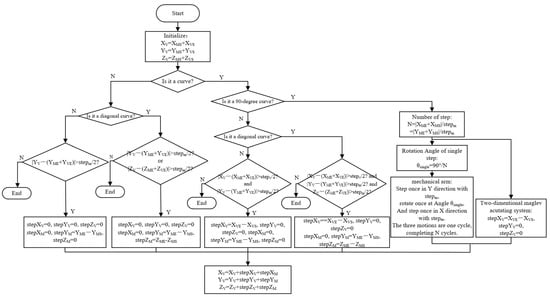 The algorithm flow chart is shown in Figure 16, where stepm denotes the unit step length of the mechanical arm; stepv denotes the unit step length of the ball offset in the two-dimensional maglev actuating system; stepXM, stepYM, and stepZM represent the feed step of the mechanical arm in X, Y, and Z directions; stepXV, stepYV, and stepZV represent the relative offset feed step of the ball in X, Y, and Z directions in the two-dimensional maglev actuating system; (XMS, YMS, ZMS) denote the starting position of the mechanical arm; and (XME, YME, ZME) denote the target position of the mechanical arm. (XVS, YVS, ZVS) denote the relative starting position of the ball in the two-dimensional maglev actuating system, (XVE, YVE, ZVE) denote the relative target position of the ball in the two-dimensional maglev actuating system, and (XE, YE, ZE) = (XMS + XVS, YMS + YVS, YMS + YVS).