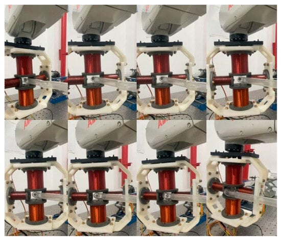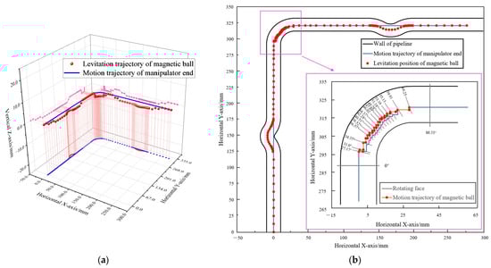 As can be seen in Figure 19, in the actuating process of the straight pipes, the Y-axis motion is rough-adjusted by the mechanical arm, and the Z-axis motion is fine-adjusted by the maglev actuating system. In the actuating process of the left bending in the straight pipe, the Y-axis motion is adjusted by the mechanical arm, and the X-axis position offset motion in the negative direction is realized by the maglev actuating system. In the actuating process of 90-degree bending in the pipes, the motion of the X-axis and Y-axis is roughly adjusted by the mechanical arm, and the positions of X, Y, and Z three-dimensional directions are fine-adjusted by the maglev actuating system to prevent the ball from touching the inner wall of the pipes. During the actuating process, the magnetic ball is deflected from 0° to 86.53° through motion coordination to realize the passage of the right-angle bending inside the pipes. In the actuating process of the right bending in the straight pipes, the X-axis motion is adjusted by the mechanical arm, and the Y-axis position offset motion in the negative direction is realized by the maglev actuating system.
