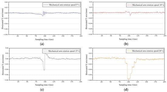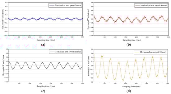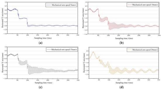 Because the vertical motion of the ball does not coincide with the horizontal motion in the pipe, the sudden vertical movement of the ball is affected by the operating state of the mechanical arm. The running speed of the robot arm is set as 5 mm/s, 10 mm/s, 15 mm/s, and 20 mm/s, respectively, and the descending motion of the magnetic ball during the horizontal operation of the system is tested. The fluctuation responses of the descending levitating motion of the magnetic ball at different horizontal speeds of the mechanical arm are shown in Figure 22.