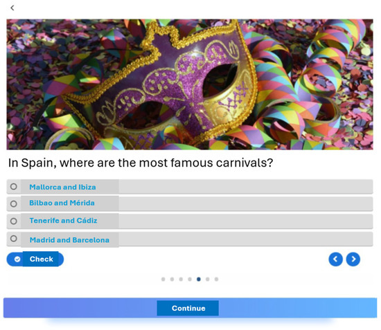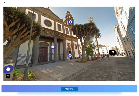 - Strolling the streets: Immersive experiences significantly enhance cognitive stimulation. Strolling the Streets is one of the challenges featured in the application. This interactive virtual tour uses 360-degree images of the city of San Cristóbal de La Laguna on the island of Tenerife. As users progress through the tour, they encounter points with information and interesting facts about the locations they visit. At the end of the activity, a quiz on the tour’s information is conducted to determine the user’s score for the challenge. This experience helps improve attention, memory, and concentration. Additionally, if users recognize the places they visit, their motivation increases, as seen in the Tandem game, making the experience more engaging and enjoyable (Figure 5).