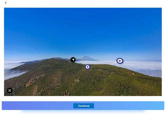 - Strolling the clouds: Similar to the previous challenge, this is an interactive virtual tour created with 360º images of Teide National Park on the island of Tenerife. As users progress through the tour, they encounter points with information and interesting facts about the locations they visit. At the end of the activity, a quiz based on the tour information is conducted to determine the user’s score for the challenge (Figure 6).