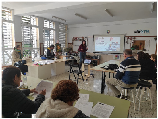 The study involved 12 older adults (11 females, 1 male) aged between 55 and 75, all enrolled at the Popular University in Gran Canaria, Spain. This institution allows individuals aged 50 or over to access educational programs to promote lifelong learning. Participants’ prior experience with technology varied, though all were regular users of digital devices for communication and entertainment purposes. Detailed demographic information is presented in Table 2, and a snapshot of the workshop can be seen in Figure 7.