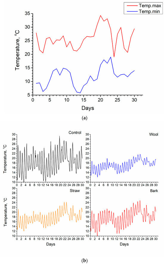 During the experiment in summer, typically for the Polish climate, the day temperatures ranged between 20 and 30 °C. At the same time, unusually for this season, several cold nights with temperatures below 10 °C occurred. The differences between day and night temperatures exceeded several degrees, which is relatively high for Polish climatic conditions. The high air temperatures and solar operation increased the soil temperature during the days. For mulched plots, the excessive sun-induced heating of the soil’s surface was prevented, and the temperature increase during the day was minimised. During cold nights, when the soil temperature rapidly decreased, rapid cooling was suppressed for mulched plots, and the temperature remained a few degrees higher. Consequently, the mulch significantly minimised the daily temperature fluctuations.