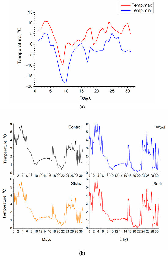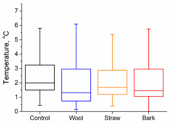 The soil temperature was above zero throughout the month, so the soil remained unfrozen. When the field was covered with snow in the middle of the month, the day and night temperatures were approximately even with each other, so no differences between day and night temperatures were detected. At this time, the soil temperature was minimally lower for plots mulched with bark and wool. Differences between day and night temperatures were observed during the snowless periods at the month’s beginning and end. For most days, the differences were slight and did not exceed 2 degrees. Differences in day and night temperatures were similar for both control and mulched plots. Compared to summer months, the observed differences in the soil temperature were a few times smaller (