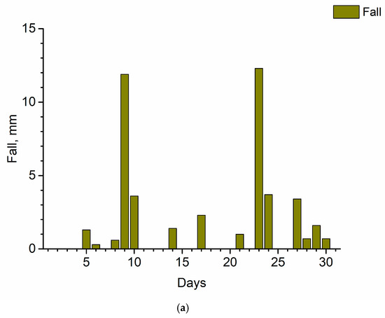 Figure 6b) in experimental plots in June 2023. This month, the total precipitation was 45 mm, much less than the average rainfall for this area. Throughout the month, the more extensive rainfall above 12 mm was registered on two rainy days, which occurred approximately two weeks apart in the first and second half of the month. Between these days, a period without or only light rain was noted. Then, at the end of the month, a few rainy days with low precipitation below 4 mm were recorded.