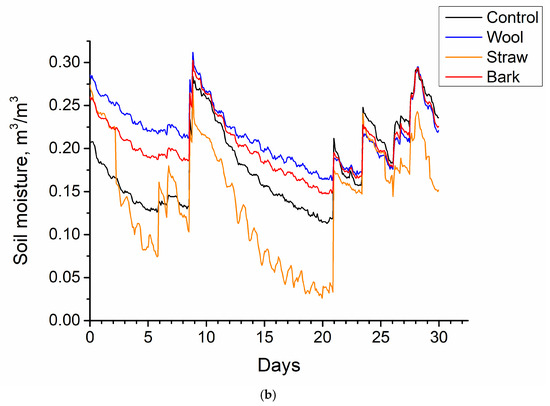 When analysing soil moisture, it is evident that soil humidity is strictly correlated with weather conditions in the absence of artificial irrigation. For the control plots not covered with mulch, raindrops fall between strawberry plants directly on the soil surface, so soil moisture immediately increases during rains. The falling water interacts with the mulch material for mulched plots before reaching the soil surface. The interactions involve several physical phenomena, including wetting the material’s surface, water transport, and water retention.