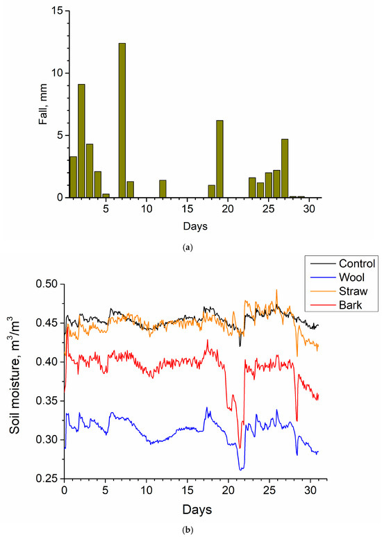 During rain, falling drops first wet the mulching material. Then, part of the water is absorbed inside the mulch material, while the rest is transported through the mulch layer to the soil surface. During heavy rainfall, the amount of falling water exceeds mulch absorption capacity. Thus, water not absorbed in the mulch seeps into the soil, quickly raising the soil moisture to a high value. As a result, immediately after heavy rain, for all mulched and unmulched plots, the soil moisture in its subsurface layer is almost the same, independent of the presence and kind of mulch material.