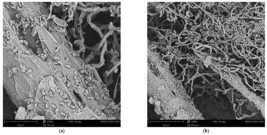 Figure 9a). With time extension, the number of fungi significantly increased. Simultaneously, intense mycelium growth was observed in the space between the fibres. After the next months, the mycelium, forming a network of branching, tube-like filaments a few µm in diameter, became denser and filled almost the entire available space (