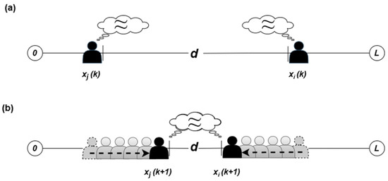Example of positive influence between two agents. (a) Represents the two agents with similar ideas; (b) represents the adjustment of their opinions by reducing their differences.