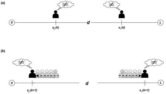 Example of negative influence between two agents. (a) Represents the two agents with different ideas; (b) Represents the adjustment of their opinions by increasing their differences.