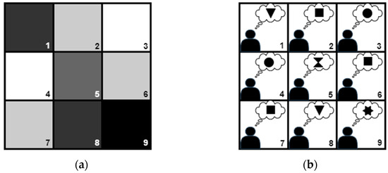In the presented framework, the image depicts a population containing N agents set within an matrix. With this structure, each pixel on the image represents an individual in the population, with its position denoted as , who takes an opinion represented by . This opinion is initially determined by the pixel intensity value. Consequently, a value in the range from 0 to 255 is considered in order to quantify the modeled opinion, because digital mapping normally uses the same scale of grayscale intensity values. This configuration establishes a distinct connection between a pixel’s grayscale value and the perspective of the individual it embodies. Such a foundation facilitates future interactions and alterations driven by social influence and the evolving opinion dynamics among the represented pixels. As these pixels engage with one another, their collective representations can shift, reflecting the complex interplay of perspectives that shapes the overall image. Figure 3 illustrates the relationship between a sub-image (a) and the viewpoints defined by each pixel for a group of individuals (b). It shows that, while most elements maintain similar intensity levels or viewpoints within the range (2–9), one element, represented by (1), stands out with a markedly different opinion, highlighting the diversity of perspectives within the collective.