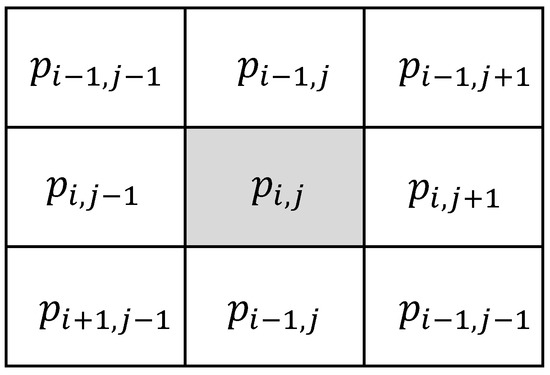 The proposed image contrast enhancement algorithm (ICE) operates with an iterative procedure. In each iteration (, two pixels of the population are chosen to simulate the dynamics of opinion interaction. The procedure starts with the selection of an initial pixel from the total image. Consequently, the next pixel is chosen to interact with the first one. In a well-defined population, rules are given to guide the preference criteria for the second pixel. In this scenario, each element interacts directly with one of its neighboring counterparts. This interaction fosters a flow of influence, allowing each element to adapt and respond to the dynamics of its environment. This second individual is randomly selected among the eight potential pixels in a () neighborhood V centered close around , securing the interactions between them. Figure 4 specifies a structured neighborhood V to select the second pixel . This localized interaction model is highly important in algorithm performance to simulate the process of opinion formation and evolution, emulating opinion dynamics using social sciences and image processing.