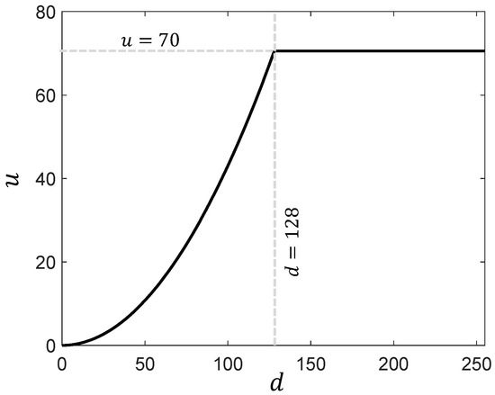 The behavior of the function used to determine the value of u from d for contrast enhancement. It demonstrates how the value of changes in relation to the difference between pixel intensity values.