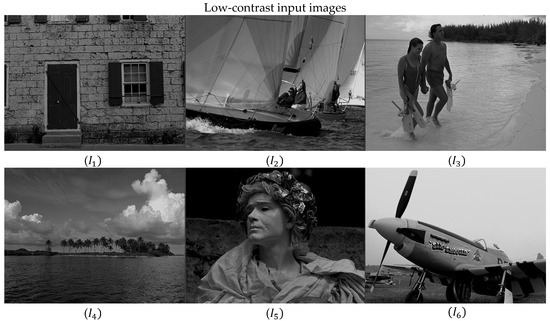 The contrast enhancement experiment was conducted on the entire image dataset. However, due to space limitations, the results are presented for a subset of images. Six images (from ) were selected because they represent varying levels of difficulty based on their degree of low contrast. These six images, which illustrate different challenges in contrast enhancement, are shown in Figure 7.