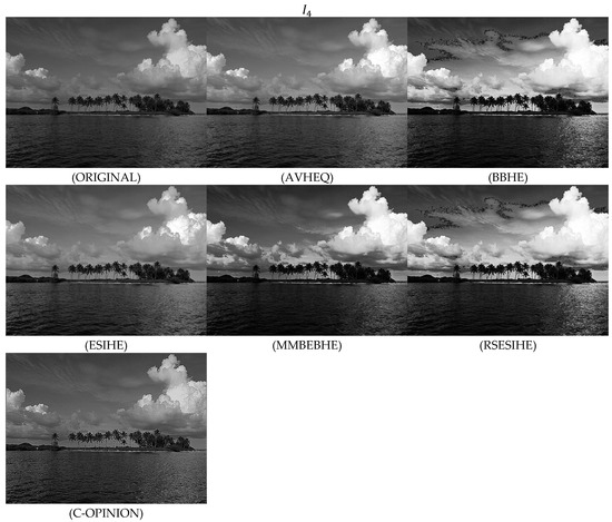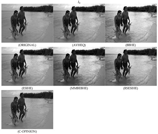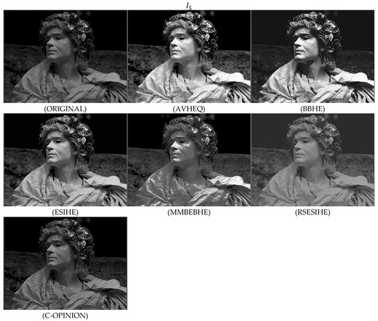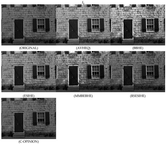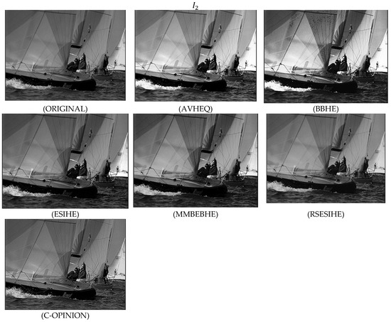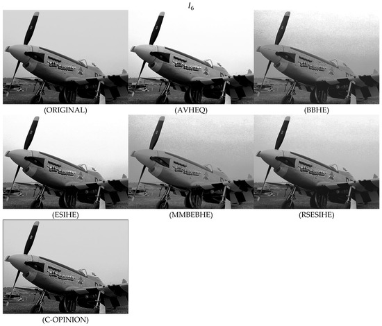 Figure 8, Figure 9, Figure 10, Figure 11, Figure 12 and Figure 13 depict the generated images by each algorithm. The initial image in each figure represents the original low-contrast input image, and the subsequent images represent the best-processed images of each method employed: AVHEQ [19], BBHE [18], ESIHE [20], MMBEBHE [17], and RSESIHE [16], as well as the proposed method, CONTRAST-OPINION.