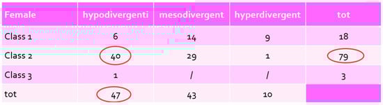 Vertical Profile: 47% of female patients were hypodivergent, 43% were mesofacial, and 10% were dolichofacial.