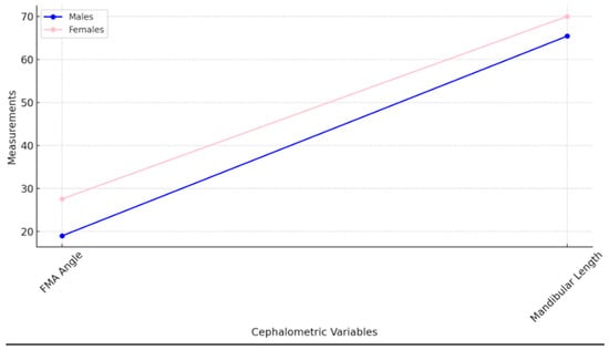 Mandibular Length: Female patients exhibited a shorter mandibular length (70 mm) than males (65.41 mm), which may have contributed to the higher prevalence of Class II profiles among females.