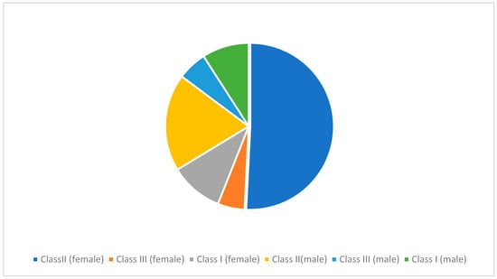 This pie chart shows the percentage distribution of Class I, II, and III profiles by sex, highlighting the prevalence of Class II in females.