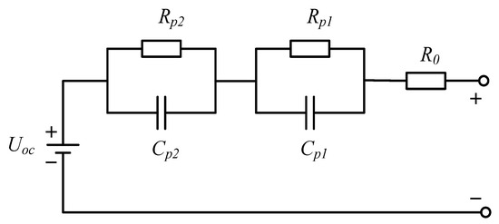 R 0 represents the ohmic resistance, while R p 1 and R p 2 denote the polarization resistances of the battery, and Cp1 and Cp2 represent the capacitances of the battery.
