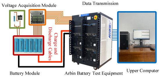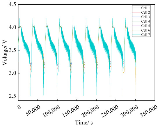 In order to verify the feasibility of the method proposed in this paper, this paper uses seven 2.55 Ah lithium-ion batteries (18,650) connected in series to conduct the U.S. federal city driving conditions cycling experiments in which cell 7 is a lower-capacity battery, and the first six experiments of the battery pack involve normal cycling, while the seventh to ninth experiments involve the static phase of cell 6, respectively, with the parallel connection of 3000 Ω, 1000 Ω, and 500 Ω resistors at both ends of the simulated internal short-circuit process. The experimental platform is shown in Figure 3 (where the manufacturer of the Arbin battery tester is Arbin Corporation, headquartered in University Town, TX, USA), and the voltage data of seven batteries in nine cycles are shown in Figure 4. The voltage curves of the seven batteries are nearly identical, indicating strong consistency among the batteries used. Additionally, this observation suggests that when a slight internal short circuit occurs in the batteries, no abnormalities can be detected solely through voltage variations. Therefore, it further emphasizes the need to identify features that can better reflect battery abnormalities. In the following text, an algorithm combined with experimental data will be introduced to verify the use of the historical trajectory of remaining discharge capacity as a feature for the fault diagnosis of lithium-ion batteries.