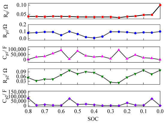 An experimental analysis was conducted using the algorithm introduced in Section 4, as shown in Figure 5. The results depict the parameter identification of the second-order equivalent circuit model for cell 1 during the first cycle using SSA. The five subfigures correspond to the variation of the parameters R0, Rp1, Cp1, Rp2, and Cp2 at every 5% SOC of the battery pack, respectively. R0 stays relatively smooth throughout the discharge process, the two parameters Rp1 and Rp2 show some fluctuations at different SOCs, and the two capacitance parameters Cp1 and Cp2 also show fluctuations during SOC variations, which indicate that the dynamic characteristics of the battery changes with the change of SOC [16].