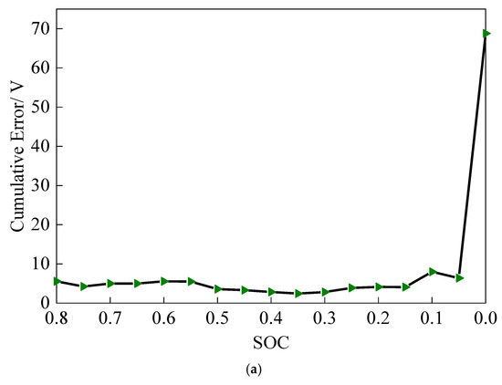 Figure 6a shows the cumulative error during parameter identification at every 5% SOC of the battery pack. The cumulative error is generally at a low level in the range of 8% to 5% SOC, staying within 10 V. However, it rises sharply at the last 5% SOC, and the cumulative error reaches 68.79 V. This is consistent with the sharp change of the R0 parameter at a low SOC in Figure 5, which indicates that the identification of the model parameters becomes more difficult, and the error increases when the battery is discharged too close to 0%. This is due to the instability of the battery performance at a low SOC [17].
