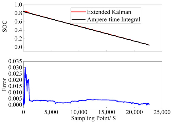 In Section 5.2, the results of SOC estimation for lithium-ion batteries using the EKF obtained by using the algorithm introduced in Section 4 are presented, as shown in Figure 7. The data where the SOC of the battery pack is greater than 5% is truncated and compared with the SOC obtained by the ampere-hour integration method. At the same time, the error between the two is presented. The SOC estimation results of the EKF method and the ampere-hour integration method have small errors. The error graph shows that the EKF method has a large error at the beginning of discharge, but the SOC gradually converges in the subsequent discharge estimation, and the error gradually decreases, remaining within 0.05. The RSME is 0.0049, and the MAE is 0.0034. As shown in Table 1, the RSME of the GA + EKF algorithm is 0.0063, and the MAE is 0.0051. In comparison, it proves the effectiveness of SSA and EKF in SOC estimation, and that the EKF can accurately track the changes in SOC.