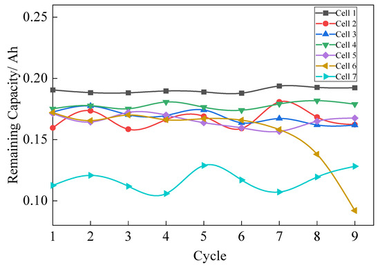 Shown in Figure 8 is the remaining discharge capacity change curve, which depicts the remaining discharge capacity under different cycles from cell 1 to cell 7. Among them, cell 7 is a lower-capacity battery, and observing the change in the remaining discharge capacity of cell 6, it can be seen that there are fluctuations in the remaining discharge capacity of cell 6 in the first 6 cycles, and the remaining discharge capacity of cell 6 decreases significantly in the 7th–9th cycles, which is precisely due to the occurrence of an internal short circuit in cell 6. This corresponds to the parallel connection of the 3000 Ω, 1000 Ω and 500 Ω resistors on both ends of cell 6 in the static stage of the experiments of the 7th–9th cycles, respectively. Overall, 3000 Ω, 1000 Ω, and 500 Ω resistors were connected in parallel at both ends of cell 6 during the resting phase of the 7th–9th cycle experiments to simulate the occurrence of an internal short circuit. The significant reduction in the remaining discharge capacity is consistent with the fact that the lower the parallel resistance of the battery, the more severe the occurrence of internal short circuits. After the 9th cycle, the remaining discharge capacity of cell 6 is lower than that of cell 7 with lower capacity. This proves that the internal short-circuit fault of cell 6 is becoming more and more obvious. Therefore, in this paper, the remaining discharge capacity of the battery is used as the feature vector to do the fault diagnosis analysis of lithium-ion battery.