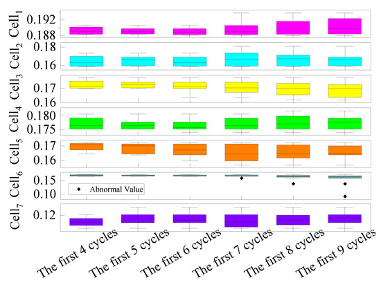 This paper utilizes box plots to perform fault diagnosis on feature vectors, with the feature value being the remaining discharge capacity of the battery, as shown in Figure 9. For each cell, the remaining discharge capacity after 9 cycles is analyzed in combination with the box plot. The box plot principle divides the data into four parts, so this paper starts the analysis with the first four cycles and performs a box plot analysis for each additional cycle. From the fourth to the sixth cycle, no abnormalities were observed. However, starting from the seventh cycle, an abnormal value appeared in the box plot of cell 6, which was precisely the remaining discharge capacity of cell 6 (connected in parallel with a 3000 Ω resistor) after the seventh cycle. Cell 6 also showed abnormal values after the eighth cycle (connected in parallel with a 1000 Ω resistor) and the ninth cycle (with two abnormal values). The abnormal value from the eighth cycle was at the upper side, while the abnormal value from the ninth cycle was precisely the remaining discharge capacity of cell 6 (connected in parallel with a 500 Ω resistor). Other cells, including cell 7 of low capacity, showed abnormal values.