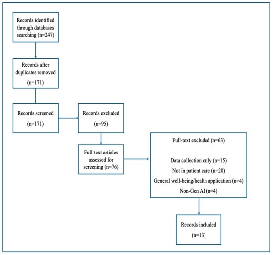 Exclusion criteria included non-original research (e.g., editorials, commentaries, or reviews). Additionally, studies exclusively focused on patient monitoring, remote monitoring, intensive/emergency care, or other general monitoring tools were not considered, as the review specifically targeted the use of generative AI in direct patient care planning.